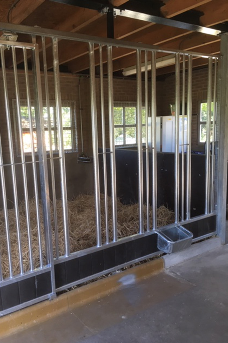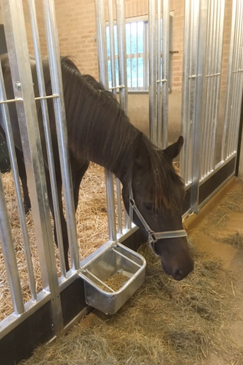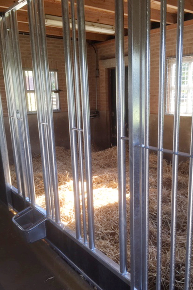 De onderzijde van de voerwand is tot 120 cm gesloten met sterke kunststof planken. Dit voorkomt morsen en zorgt voor rust in de box. Daarboven zijn spijlen geplaatst voor een open en luchtige uitstraling. Je kiest zelf de kleur van de planken, zodat de voerwand perfect past bij de stijl van jouw stal.
