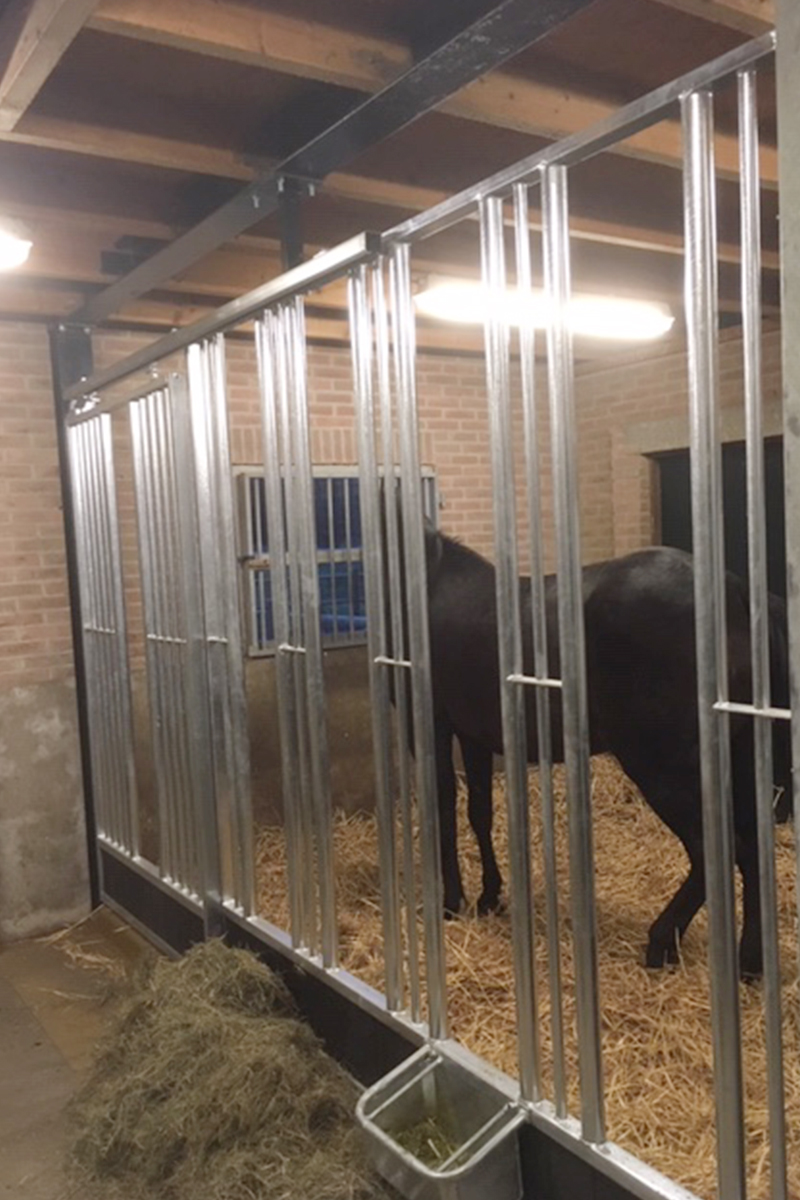 Het stevige frame is opgebouwd uit kokers van 50x30x2 mm, wat zorgt voor maximale stabiliteit en een lange levensduur. De ronde spijlen (25×1,5 mm) met een tussenruimte van 60 mm bieden een veilige en comfortabele afscheiding voor je paard, zonder in te leveren op ventilatie en zicht.